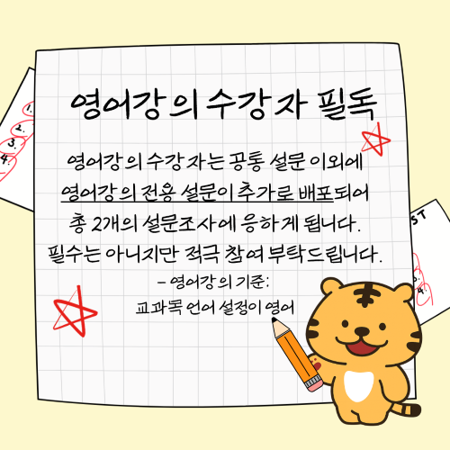 7. 학생 여러분의 영어 강의 만족도 파악을 위해 교과목 언어 설정인 영어인 경우 별도 문항이 추가 제공될 수 있습니다.